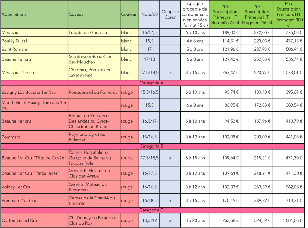 Je vous enverrai prochainement la liste précise des meilleures cuvées et de nos cibles !