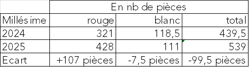 Bien que plutôt faible, le nombre de pièces mises à la vente est en hausse par rapport à la vente 2024. Plus de rouge mais moins de blanc !
